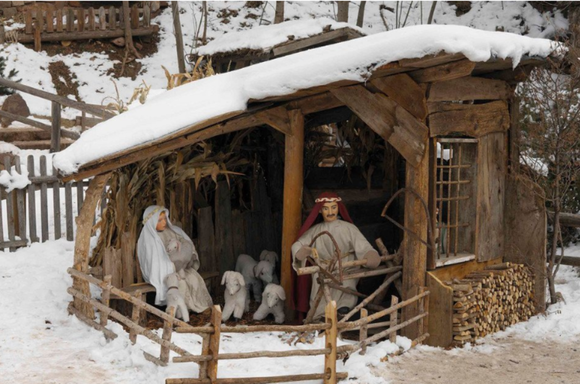 L’enorme Presepio viene sistemato sul prato innevato che costeggia via Alpini e occupa 2500 metri quadrati. Quando scende la notte, 200 punti luce illuminano la Natività creando un’atmosfera incantata.