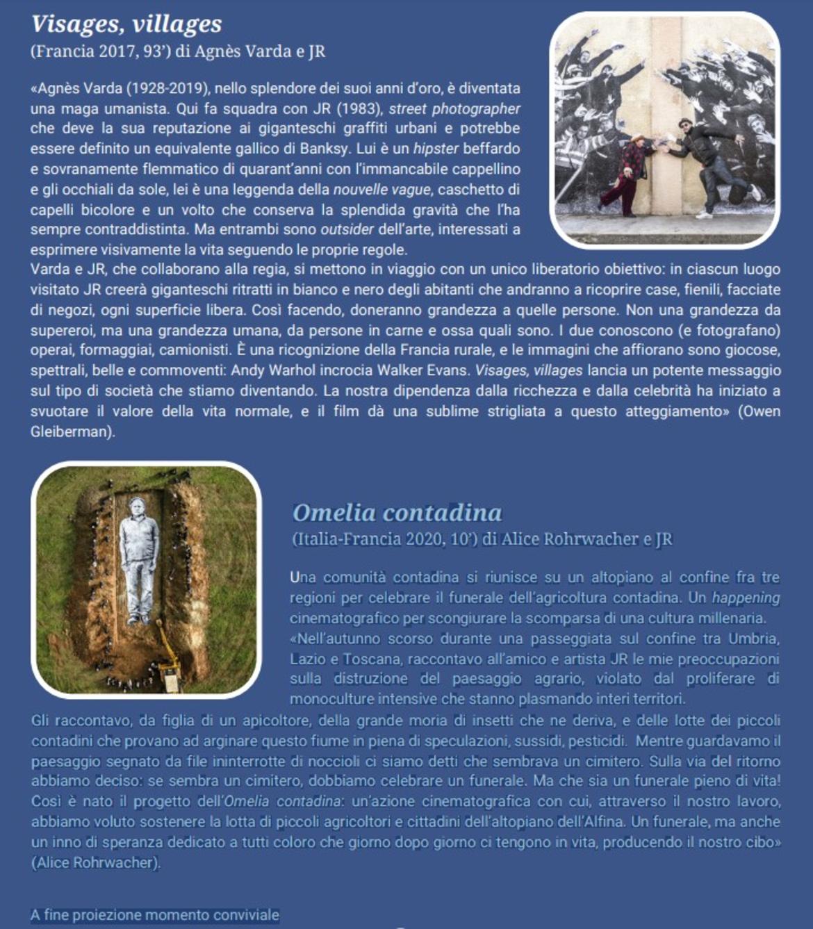 Una comunità contadina si riunisce su un altopiano al confine fra tre regioni per celebrare il funerale dell’agricoltura contadina. Un happening cinematografico per scongiurare la scomparsa di una cultura millenaria. «Nell’autunno scorso durante una passeggiata sul confine tra Umbria, Lazio e Toscana, raccontavo all’amico e artista JR le mie preoccupazioni sulla distruzione del paesaggio agrario, violato dal proliferare di monoculture intensive che stanno plasmando interi territori. Gli raccontavo, da figlia di un apicoltore, della grande moria di insetti che ne deriva, e delle lotte dei piccoli contadini che provano ad arginare questo fiume in piena di speculazioni, sussidi, pesticidi. Mentre guardavamo il paesaggio segnato da file ininterrotte di noccioli ci siamo detti che sembrava un cimitero. Sulla via del ritorno abbiamo deciso: se sembra un cimitero, dobbiamo celebrare un funerale. Ma che sia un funerale pieno di vita! Così è nato il progetto dell’Omelia contadina: un’azione cinematografica con cui, attraverso il nostro lavoro, abbiamo voluto sostenere la lotta di piccoli agricoltori e cittadini dell’altopiano dell’Alfina. Un funerale, ma anche un inno di speranza dedicato a tutti coloro che giorno dopo giorno ci tengono in vita, producendo il nostro cibo» (Alice Rohrwacher).