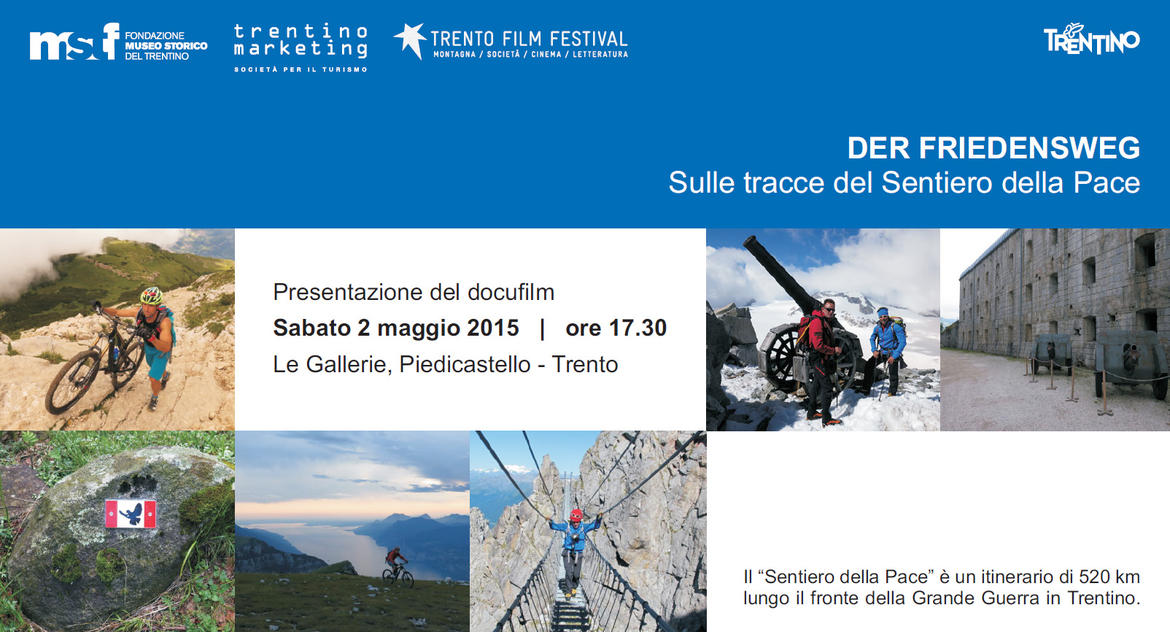 Sabato 2 maggio alle 17.30 Le Gallerie di Piedicastello ospiteranno la proiezione del docufilm tedesco (sottotitolato in italiano) “Der Friedensweg - Sulle tracce del Sentiero della Pace” di Peter Schlickenrieder, dedicato ai 520 chilometri che attraversano tutto il Trentino seguendo la linea del fronte della prima guerra mondiale. Il regista ha voluto sottolineare in particolare le differenti modalità di fruizione di questo percorso, non solo a piedi, ma anche in mountain bike, a cavallo o con il parapendio, affidando ad una serie di interviste la collocazione dei luoghi all'interno del contesto storico del conflitto. Realizzato nell'estate 2014, il documentario è stato trasmesso lo scorso dicembre in quattro puntate sulla televisione tedesca Bayerischer Rundfunk e su ARD totalizzando oltre quattro milioni e mezzo di telespettatori.