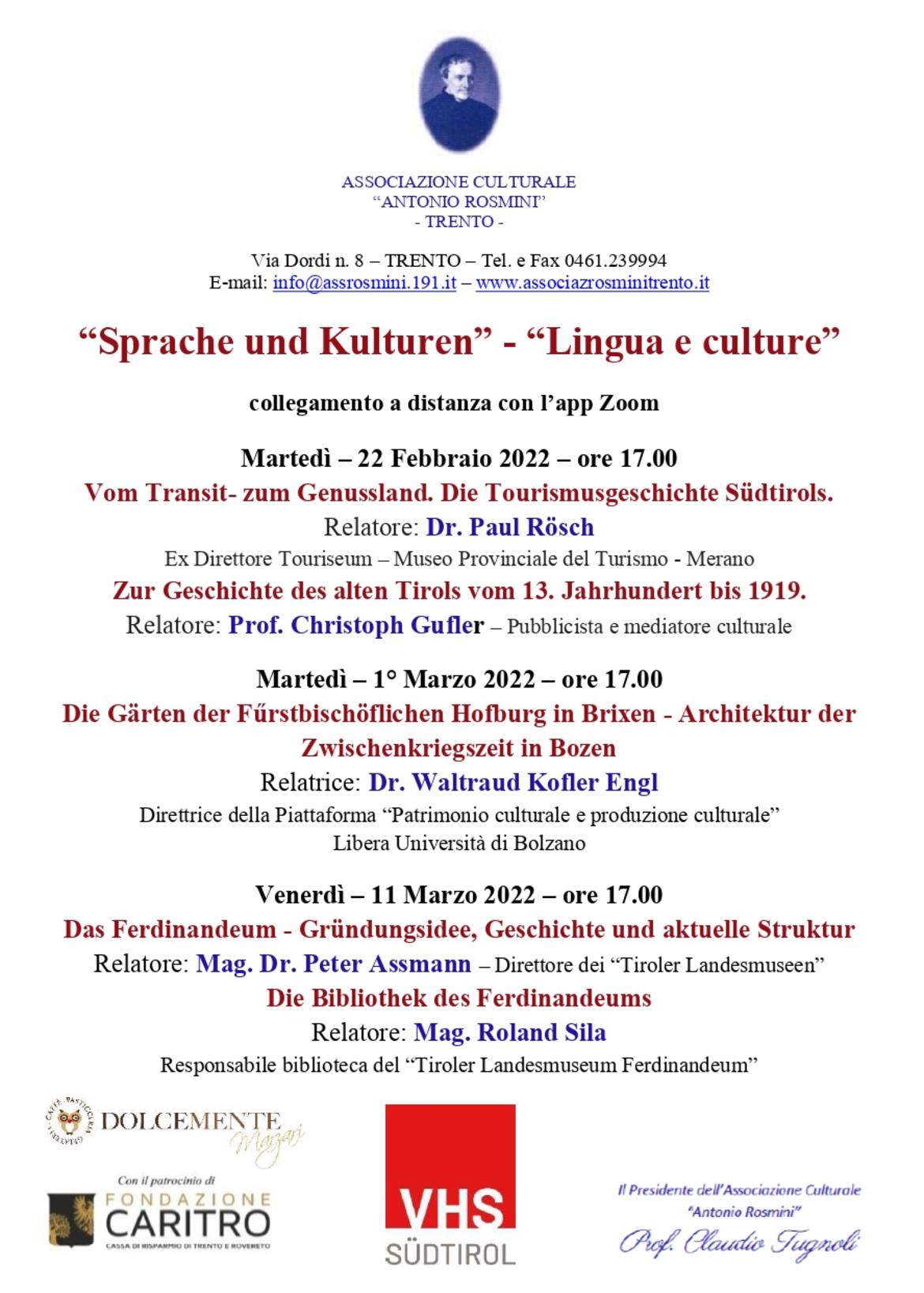 Eine Reihe von drei Online-Treffen in deutscher Sprache des Kulturvereins “A. Rosmini” in Trient. Ein Vorschlag von interessierten Personen, die die deutsche Sprache als „Instrument kultureller Bereicherung” fördern möchten.