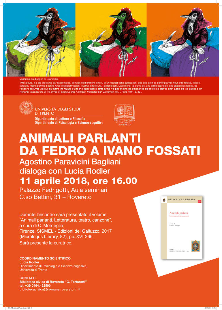 Durante l’incontro che si terrà presso Palazzo Fedrigotti (Aula convegni - c.so Bettini, 31 - Rovereto) sarà presentato il volume Animali parlanti. Letteratura, teatro, canzone, a cura di C. Mordeglia, Firenze, SISMEL - Edizioni del Galluzzo, 2017 (Micrologus Library, 82). Sarà presente la curatrice.