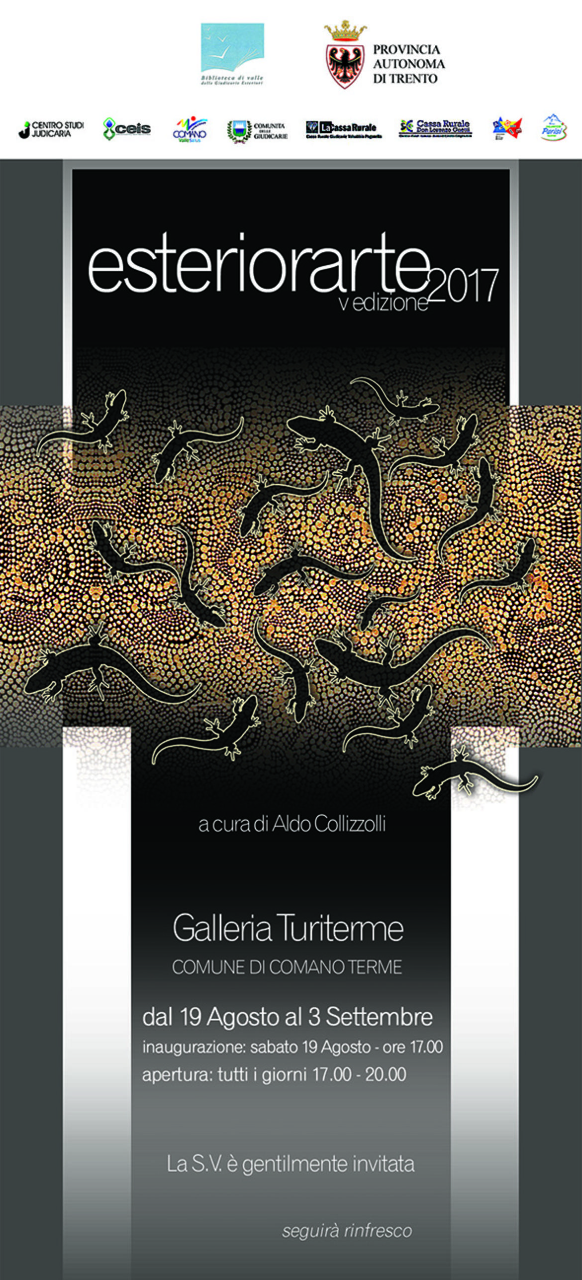 ESTERIORARTE nella sua eterogenea proposta di linguaggi artistici, si sta caratterizzando come esperienza espressiva territoriale riconoscibile, utile alla definizione e conoscenza degli stili degli autori del luogo, momento di confronto per una significativa occasione di crescita. Giunta alla quinta edizione la manifestazione voluta dalla Biblioteca di Valle e coordinata dal suo responsabile Aldo Collizzolli, vuole ribadire anche in questa occasione quanto e come il panorama artistico delle Giudicarie Esteriori, oggi, come lo fu un tempo, conservi una lodevole qualità, perseguendo contenuti di valore per una presentazione estetica dei particolari sentimenti “di estrazione alpina”.