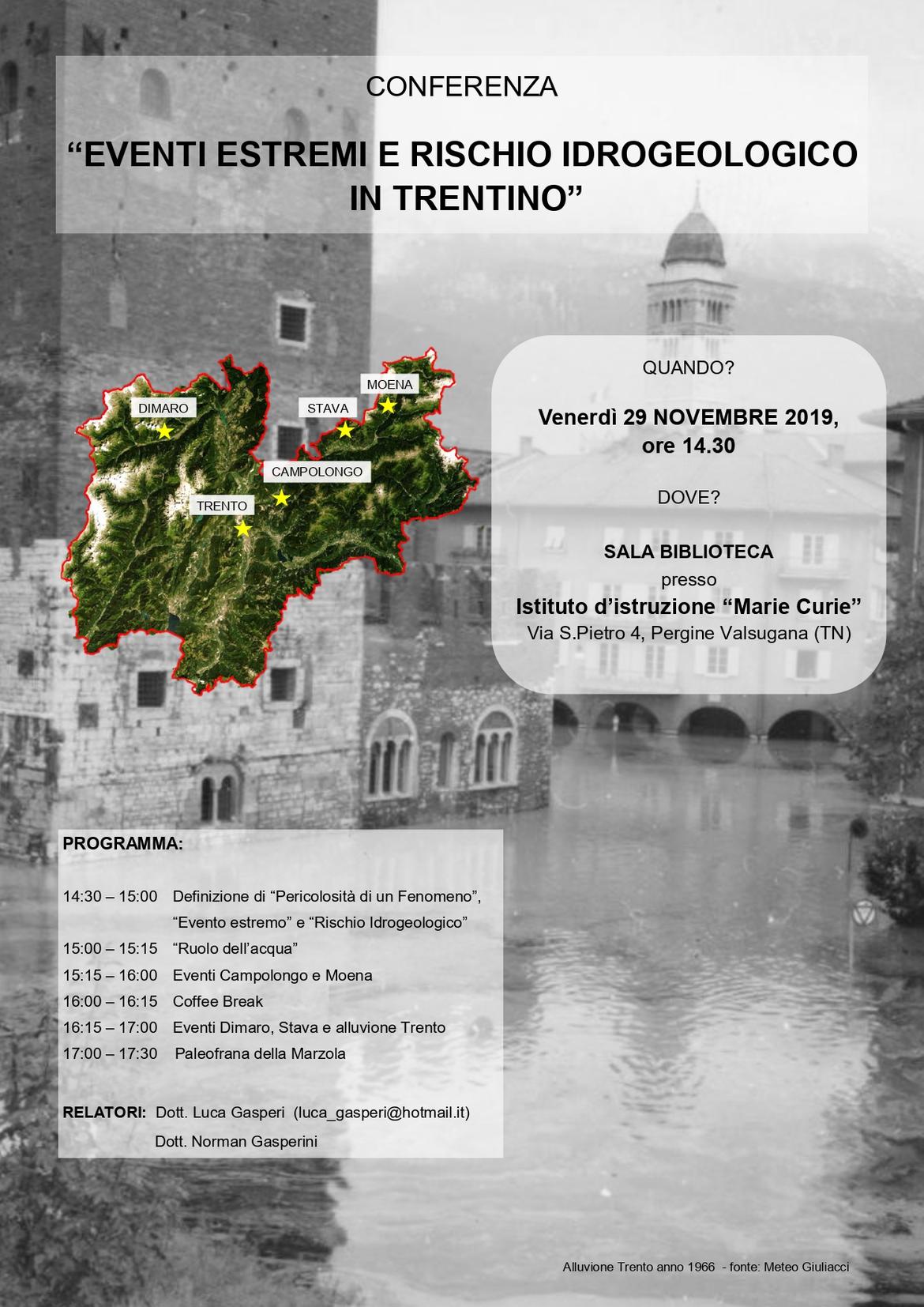 La conferenza verterà attorno al concetto di rischio idrogeologico, analizzando il territorio trentino. Saranno presentati sia dati derivanti da una statistica nazionale redatta da ISPRA (Istituto Superiore per la Protezione Ambientale) che alcuni eventi estremi di particolare rilevanza avvenuti negli ultimi anni nella provincia di Trento. In aggiunta verranno poste le basi per comprendere i concetti di rischio e pericolosità di un fenomeno ambientale.
