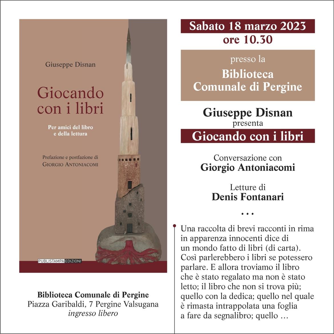Giuseppe Disnan, in dialogo con Giorgio Antoniacomi, presenterà il suo nuovo libro "Giocando con i libri. Per amici del libro e della lettura" (Publistampa Edizioni, 2023, pagine 80).
