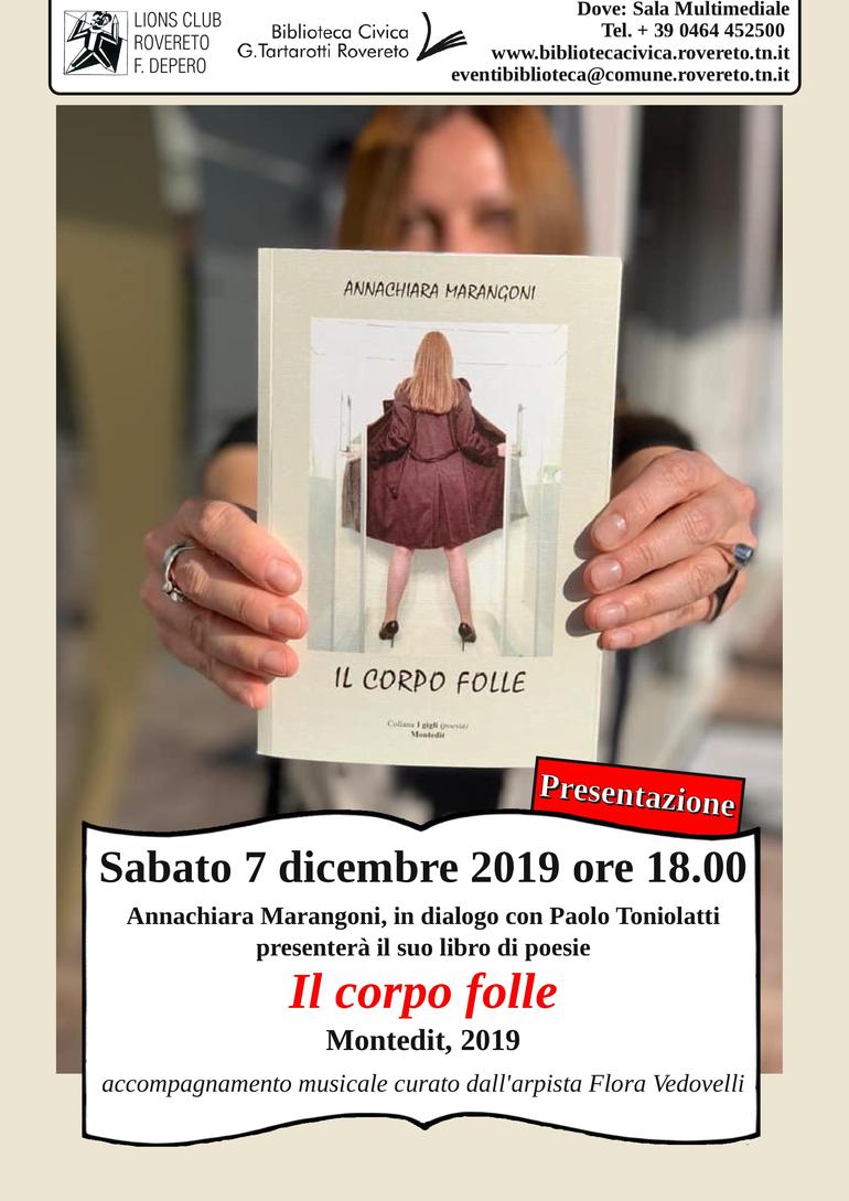 Il libro di poesia Il corpo folle prosegue un discorso iniziato e lasciato sospeso dalla poetessa Annachiara Marangoni nel 2013, con il libro Nerooro, pubblicato dalla stessa casa editrice.
