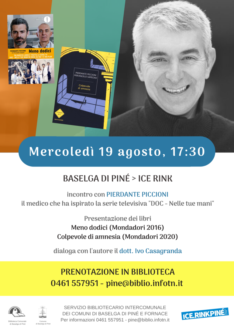 A Baselga di Piné sarà presentato in anteprima anche il suo primo romanzo Colpevole di amnesia (Mondadori 2020). Ad introdurre e moderare l'incontro il dottor Ivo Casagranda, amico e collega di Piccioni.