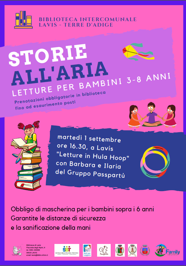 Prenotazioni obbligatorie in biblioteca (0461 240066 lavis@biblio.infotn.it) fino ad esaurimento posti. Verranno garantite le distanze di sicurezza e la sanificazione delle mani, mentre per i bambini sopra i 6 anni sarà obbligatorio l'uso della mascherina.