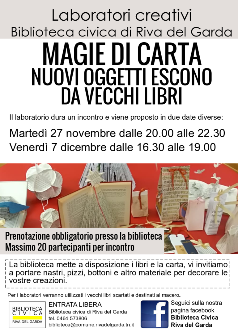 Partecipazione gratuita – prenotazione obbligatoria presso la biblioteca (tel. 0464 573806, e-mail: biblioteca@comune.rivadelgarda.tn.it)