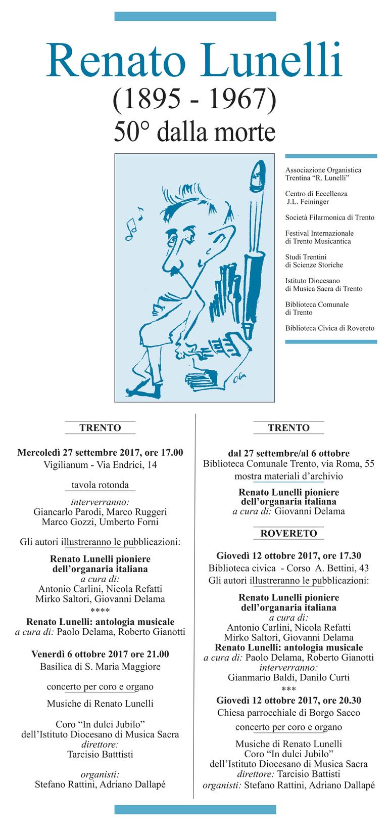 La complessa figura di Renato Lunelli oltre che studioso, uomo di cultura – il più giovane fondatore di Studi Trentini di Scienze Storiche nel 1919! – amministratore e sostenitore dell’Asilo Zanella e dell’Opera S. Vincenzo, critico musicale sui giornali del tempo, organista in S. Maria Maggiore, socio della Filarmonica di Trento, direttore e fondatore della rivista italiana L’Organo (Bologna, 1960), ha suggerito ad alcune associazioni musicali di Trento l’elaborazione collettiva di un progetto comune per rilevarne la figura in tutti i suoi aspetti e riassumere l’efficacia del suo percorso nella società di oggi.