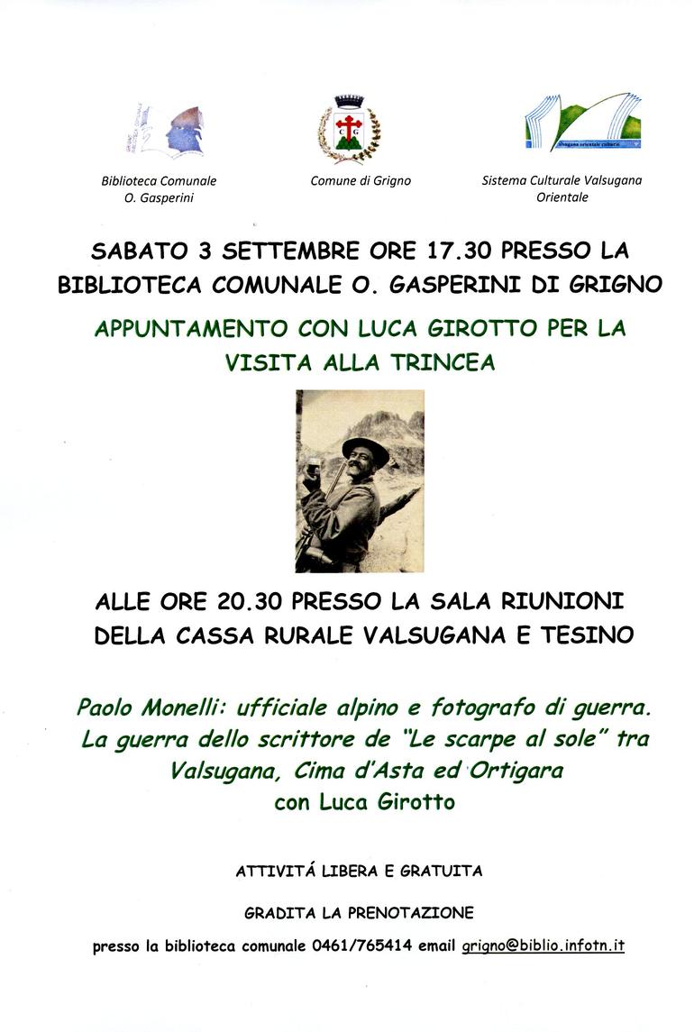 Alle ore 17.30 ritrovo presso la Biblioteca Comunale O. Gasperini di Grigno per la visita alla Trincea con Luca Girotto. Visita che si terrà anche in caso di maltempo.