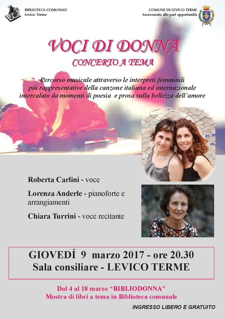 Percorso musicale attraverso le interpreti femminili più rappresentative della canzone italiana ed internazionale intercalato da momenti di poesia  e prosa sulla bellezza dell’amore con Roberta Carlini - voce, Lorenza Anderle - pianoforte e arrangiamenti, Chiara Turrini - voce recitante.