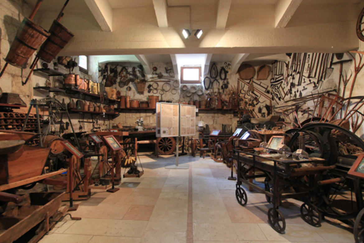 Ecco dunque rastrelli, forche di legno, tagliafieno, aratri, gioghi, falciole, crivelli, fascere utilizzati per la fienagione, la coltivazione dei campi, la lavorazione dei cereali, la caseificazione, e soprattutto un’ampia rassegna di strumenti usati per i lavori nel vigneto, per la vendemmia, la vinificazione, la distillazione, e la realizzazione dei recipienti di legno, che sono presenti nelle varie tipologie.