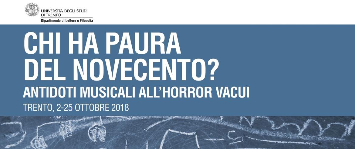 Si tratta di una rassegna di lezioni-concerto e conferenze che sarà proposta dal 2 al 25 ottobre su iniziativa del Laboratorio di Filologia musicale del Dipartimento di Lettere e Filosofia dell’Università degli Studi di Trento. Sono in calendario un concerto inaugurale, una tavola rotonda sul tema dell’horror vacui, cinque lezioni-concerto e quattro conferenze. Si rivolge agli studenti universitari e di conservatorio, ai dottorandi, alle scuole secondarie di secondo grado, all’intera cittadinanza.