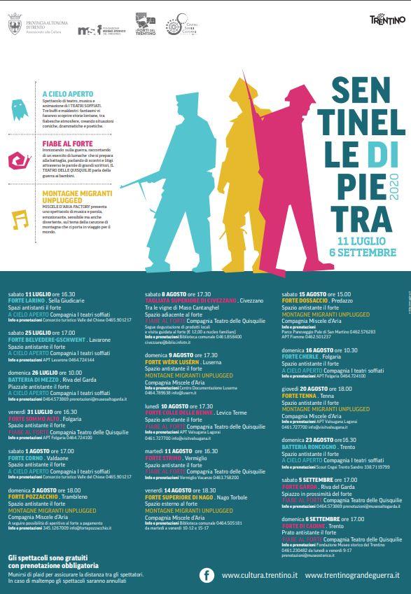 Con un programma diverso dagli scorsi anni, che dovrà giocoforza tener conto delle vigenti norme anti Covid (niente più trekking o percorsi enogastronomici e maggior distanziamento tra il pubblico), ma altrettanto ricco nei contenuti e negli spunti di riflessione che saprà offrire: tre tipologie di spettacoli, a ingresso libero, proposti da altrettante compagnie del nostro territorio (I Teatri Soffiati, Il Teatro delle quisquilie e Miscele d’aria Factory), che da sabato 11 luglio, (Forte Larino), a domenica 6 settembre (Forte Cadine) si alterneranno lungo i forti del Trentino.